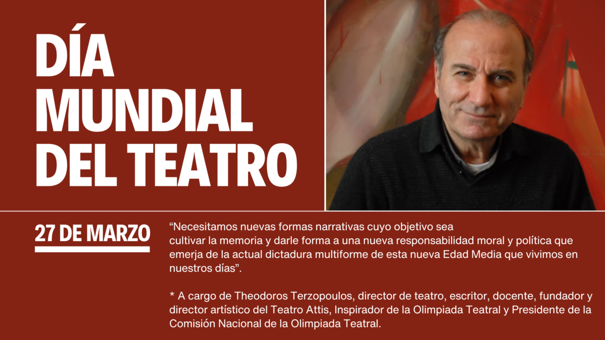 El Día Mundial del Teatro 2025 se celebra el jueves 27 de marzo. Este año el mensaje oficial corre a cargo del dramaturgo griego Theodoros Terzopoulos, quien reivindica un teatro comprometido con su tiempo, responsable y capaz de erigirse como un instrumento que ilumine a la sociedad en épocas de oscuridad. La celebración del Día Mundial del Teatro es una iniciativa impulsada por el Instituto Internacional del Teatro (ITI).