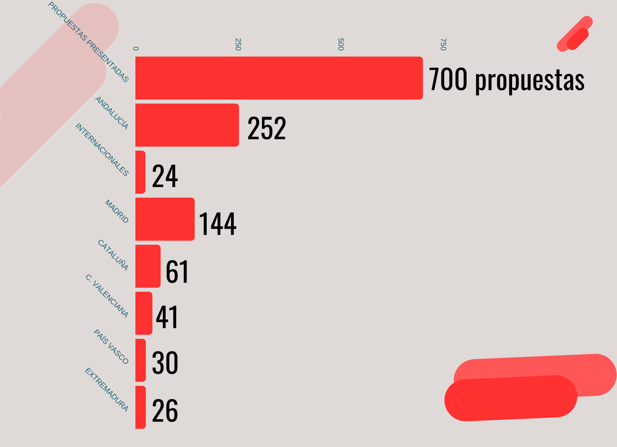 En el ámbito nacional, prácticamente todas las comunidades autónomas han presentado propuestas, a excepción de la ciudad autónoma de Ceuta. En número, destacan las propuestas de la Comunidad de Madrid (144), Cataluña (61), la Comunidad Valenciana (40), País Vasco (30), Extremadura (25), Castilla y León (18), Castilla la Mancha (17), Baleares (15), Aragón y Galicia (13), Canarias (14), Asturias y Navarra (9), Murcia (8), Cantabria (5), La Rioja (2), Melilla (1).